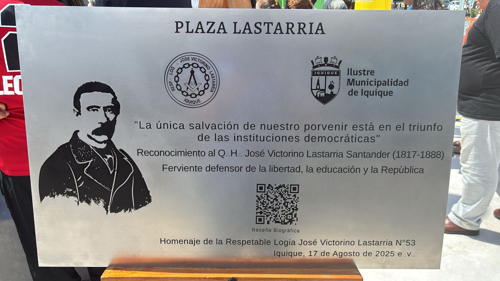 La Logia José Victorino Lastarria N°53 estuvo representada durante la ceremonia por una delegación de hermanos encabezada por su Venerable Maestro Cristian Cayo Cayo,. En el marco del acto solemne, y mediante el discurso pronunciado por el Venerable Maestro, se hizo entrega, en nombre de todos los integrantes de la Logia, de una placa conmemorativa en honor a José Victorino Lastarria, como testimonio permanente del vínculo entre la Logia, la historia republicana y la comunidad Iquiqueña.